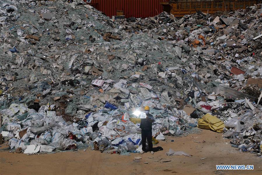 A worker collects the shattered glasses at a dump in Beirut, Lebanon, Aug. 16, 2020. Two huge explosions rocked Port of Beirut on Aug. 4, shaking buildings all over the Lebanese capital, and killing over 177 while wounding 6,000 others. Losses were estimated by Beirut's governor at more than 10 billion U.S. dollars. (Xinhua/Bilal Jawich)