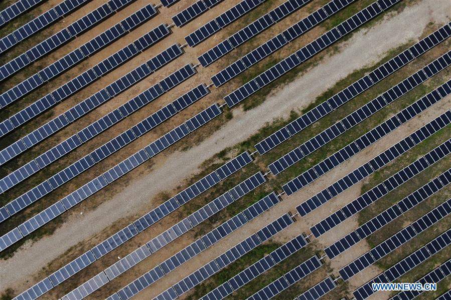 Aerial photo taken on Aug. 17, 2020 shows a photovoltaic power station at an industrial development park in the Tibetan Autonomous Prefecture of Hainan, northwest China's Qinghai Province. The photovoltaic power station here not only generates electricity but also helps increase the income of impoverished people. (Xinhua/Zhang Long)