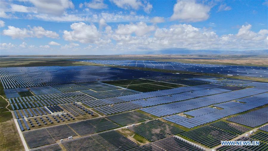 Aerial photo taken on Aug. 17, 2020 shows a photovoltaic power station at the green industrial development park in the Tibetan Autonomous Prefecture of Hainan, northwest China's Qinghai Province. The photovoltaic power station here not only generates electricity but also helps increase the income of impoverished people. (Xinhua/Zhang Long)