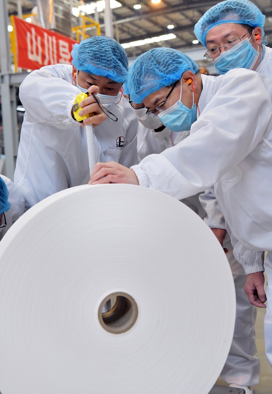 Workers examine the melt-blown nonwoven fabric, a key material for masks, made on the newly built production line at a factory of Sinopec, in Yizheng, east China's Jiangsu Province, March 29, 2020. (Photo by Liu Yufu/Xinhua)