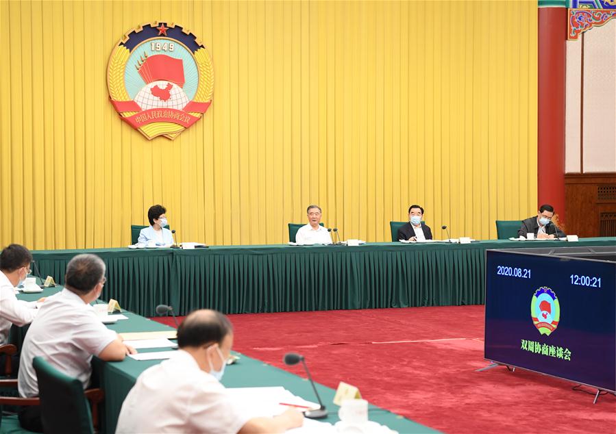 Wang Yang, a member of the Standing Committee of the Political Bureau of the Communist Party of China Central Committee and chairman of the Chinese People's Political Consultative Conference (CPPCC) National Committee, presides over a bi-weekly seminar held by the CPPCC National Committee in Beijing, capital of China, Aug. 21, 2020. (Xinhua/Shen Hong)