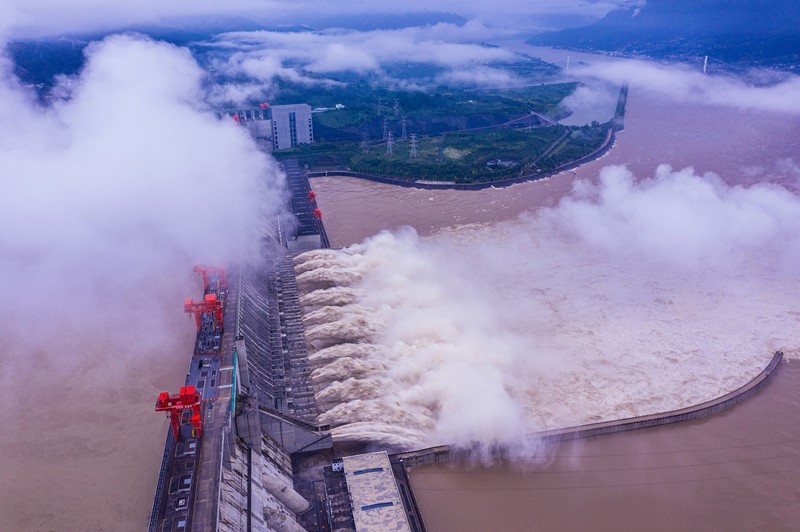In the face of the greatest flood peak since the Three Gorges Reservoir was built in 2003, 11 floodgates of the Three Gorges Dam were opened to discharge the floodwater at a rate of 49,200 cubic meters per second.