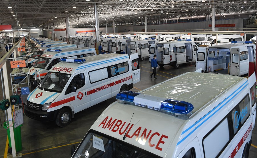Ambulances are seen at a modifying workshop of SAIC MAXUS Automotive Co., Ltd in Wuxi, east China's Jiangsu Province, Feb. 16, 2020. (Xinhua/Ji Chunpeng)