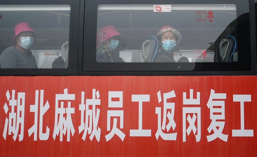 Workers from Macheng City of central China's Hubei Province arrive by chartered bus at Kunshan City, east China's Jiangsu Province, March 22, 2020. (Xinhua/Ji Chunpeng)