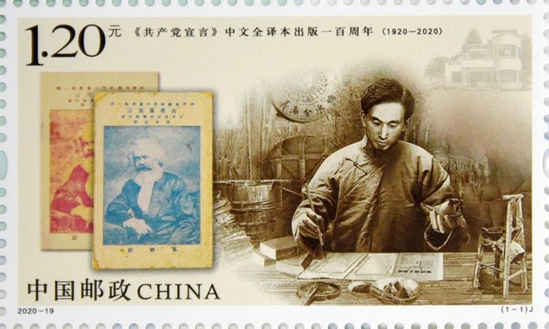 A new stamp commemorating the 100th anniversary of the publication of the full Chinese edition of the Communist Manifesto.(Photo/Xinhua)