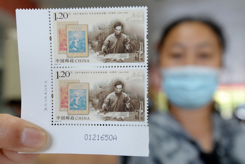 A new stamp commemorating the 100th anniversary of the publication of the full Chinese edition of the Communist Manifesto.(Photo/Xinhua)
