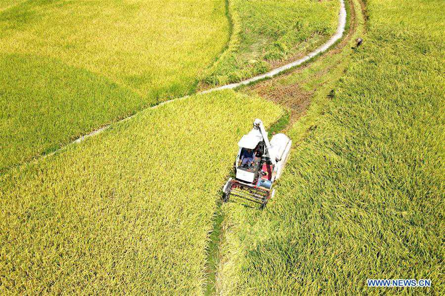 Aerial photo taken on Aug. 24, 2020 shows a reaper working in a paddy field in Huashan Village of Shuangfeng County, Loudi City, central China's Hunan Province. Paddy fields in Shuangfeng County have entered harvest season recently. (Photo by Li Jianxin/Xinhua)