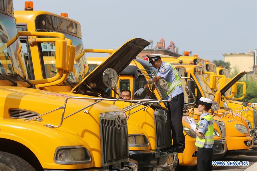 Police officers check school buses in Huaibei, east China's Anhui Province, on Aug. 24, 2020. Local police carried out safety checks on school buses before the upcoming new semester to ensure the safety of students. (Photo by Wan Shanchao/Xinhua)