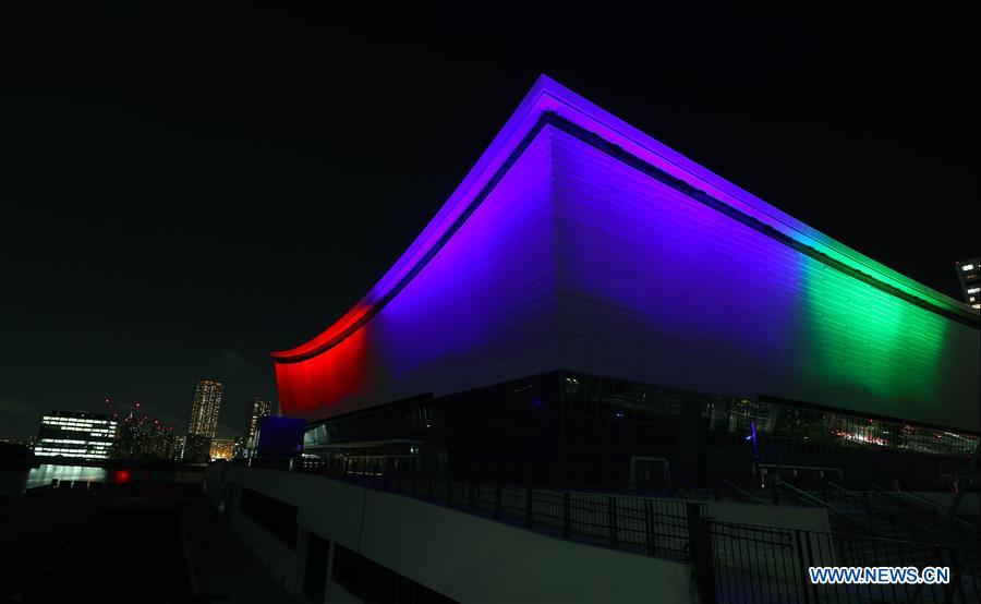 The Tokyo 2020 Paralympic Venue Ariake Arena is illuminated with the Paralympic symbol colours to mark one-year-to-go until the start of the postponed Tokyo 2020 Paralympic Games in Tokyo, Japan, Aug. 24, 2020. (Xinhua/Du Xiaoyi)