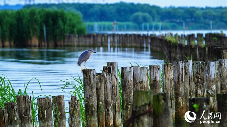 A water bird in the Daxigang Wetland Park, Xin’an neighborhood, Xinwu district, Wuxi, east China’s Jiangsu province perches on a fence above the water. (Photo courtesy of Xin’an neighborhood of Xinwu district)