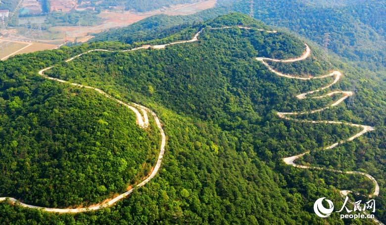Aerial photo shows a zigzagging road that has been nicknamed the “mini Sichuan-Tibet Highway” due to its beauty in Jiangning district, Nanjing, east China’s Jiangsu province. (Photo/Li Wei)