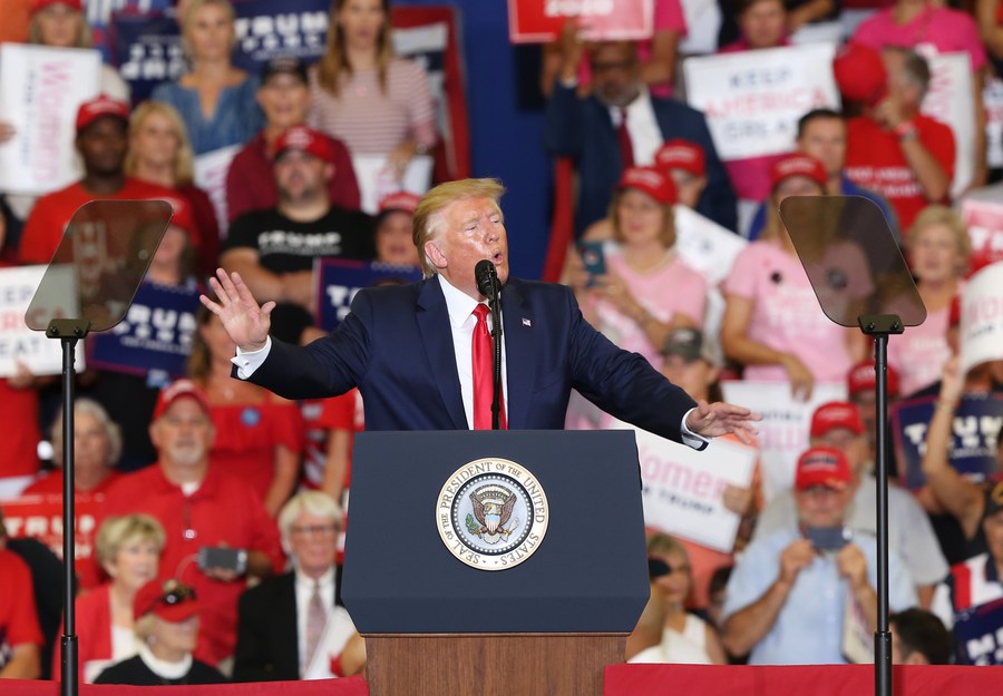 U.S. President Donald Trump participates in a campaign rally in Fayetteville, North Carolina, the United States, on Sept. 9, 2019. (Xinhua/Hu Yousong)