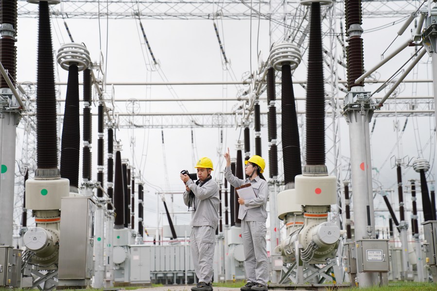 Staff members inspect the Sino-Russian 500 KVA (kilo-volt-amp) back-to-back converter station in Heihe, northeast China's Heilongjiang Province, Aug. 22, 2019. (Xinhua/Wang Jianwei)