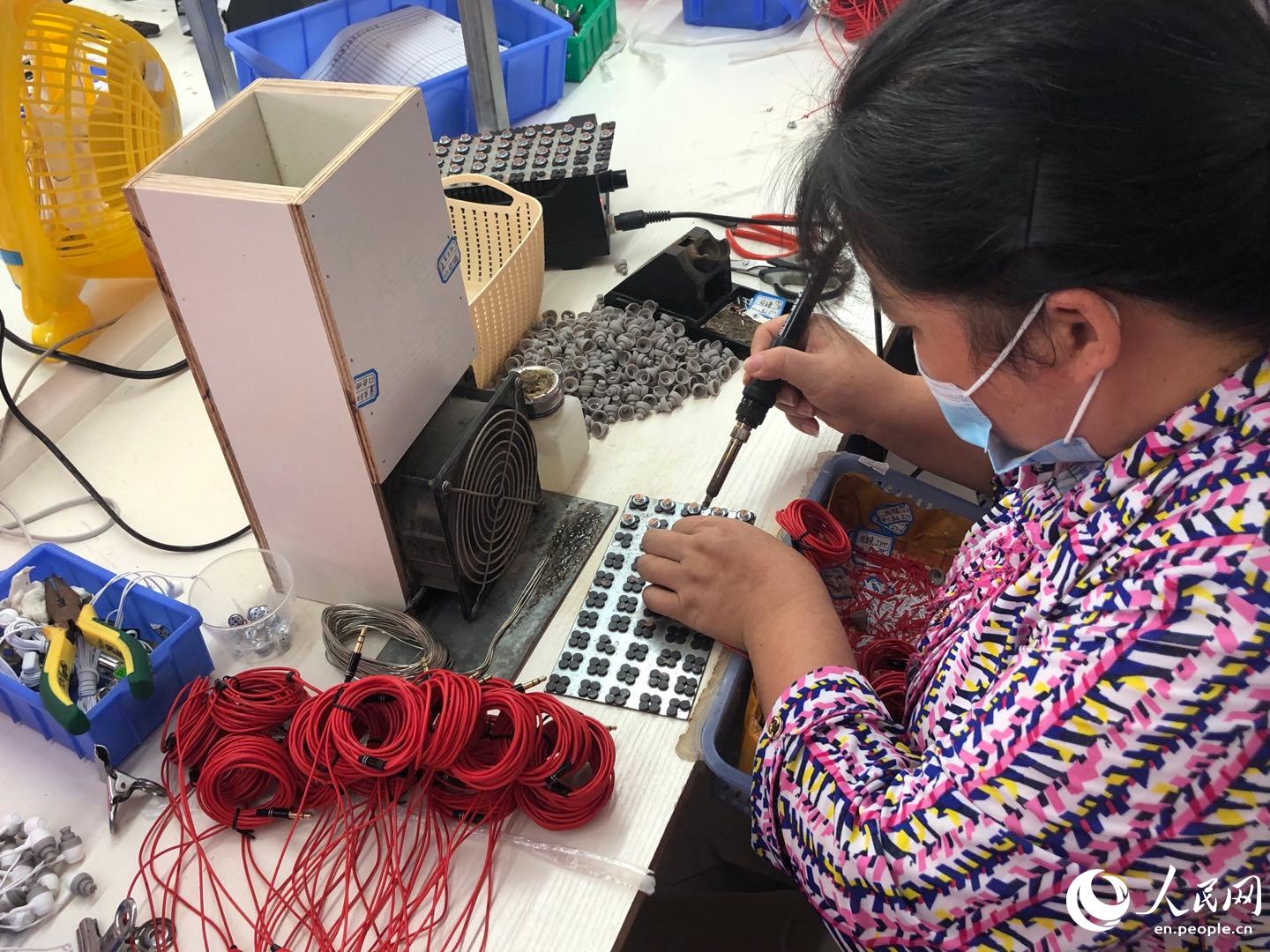 Photo taken on August 22, 2020 shows a female worker at an earphone factory at Baxian Industrial Park in Chengjiang Township of Du’an Yao Autonomous County, south China's Guangxi Zhuang Autonomous Region. (People’s Daily Online/Du Mingming)