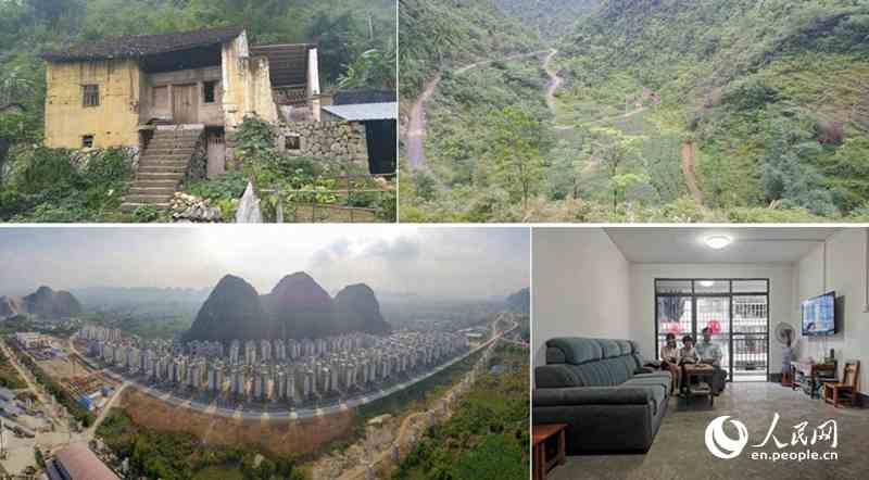 Combo photo shows Wei Biao’s former residence deep in the mountains (top, file photo), and a view of the Baxian poverty-relief resettlement site where Wei lives (bottom) in Chengjiang Township of Du’an Yao Autonomous County, south China's Guangxi Zhuang Autonomous Region. (Photo provided to People’s Daily Online)