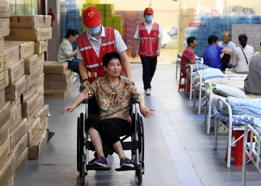 A volunteer pushes the wheelchair of a villager at a temporary shelter in the No.168 Middle School in Hefei, east China's Anhui Province, July 29, 2020. (Xinhua/Liu Junxi)