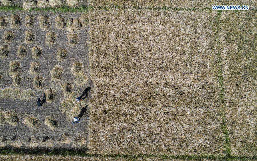 Aerial photo taken on Aug. 29, 2020 shows farmers harvesting highland barley in Gyangze County of Xigaze, southwest China's Tibet Autonomous Region. Local farmers are now busy in the fields in the harvest season of highland barley. (Xinhua/Sun Fei)