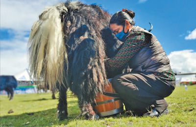 A herdswoman takes milk from a yak. (Photo/People's Daily)