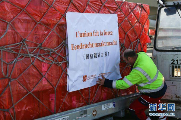 On March 16 local time, 300,000 masks from China arrive at the Liege Airport in Belgium. (Photo/Xinhua)