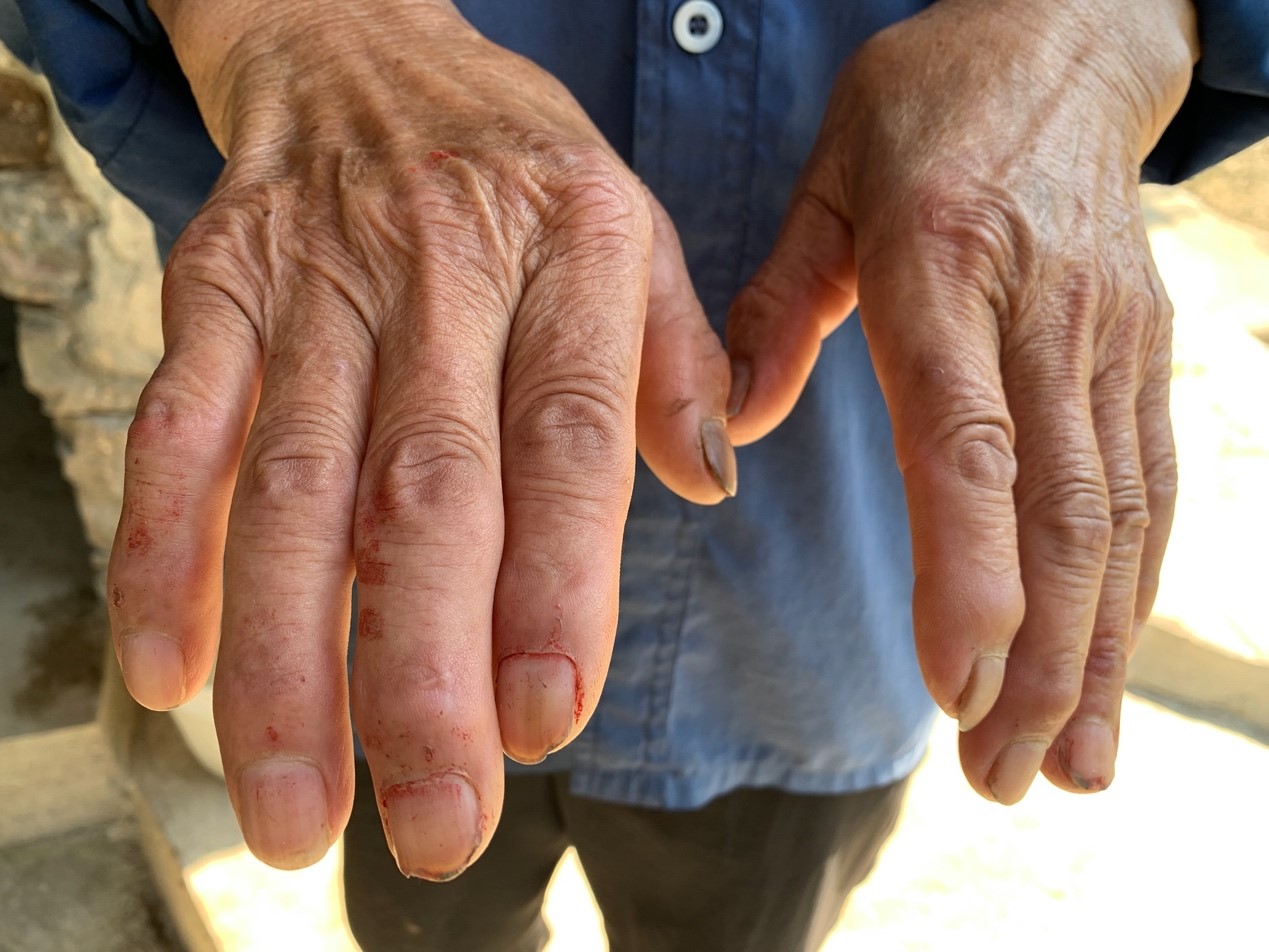 Photo taken on Aug.27, 2020 shows the toll the job has taken on Wan Qizhen’s hands. (People’s Daily Online/Zhao Tong)