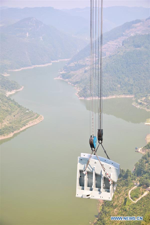 Photo taken on Sept. 1, 2020 shows the construction site of Kaizhou Lake grand bridge of Weng'an-Kaiyang expressway in southwest China's Guizhou Province. The cable saddles on the main tower of Kaizhou Lake grand bridge of Weng'an-Kaiyang expressway were successfully installed on Tuesday. (Xinhua/Liu Xu)