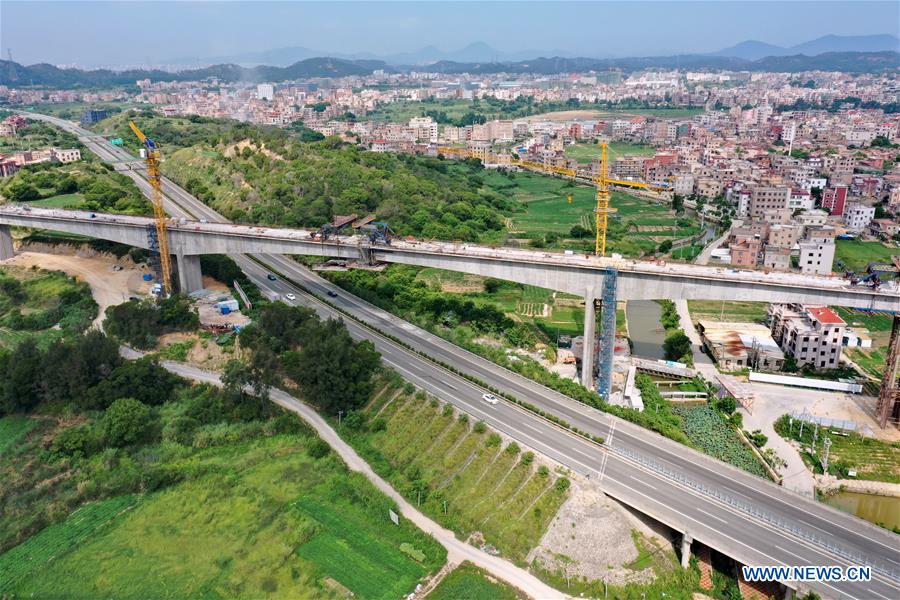 Aerial photo taken on Sept. 1, 2020 shows the construction site of the closure of a long-span bridge over an expressway in southeast China's Fujian Province. The closure operation of the 1.8 km-long bridge was successfully conducted on Tuesday. The bridge is part of the province's Fuzhou-Xiamen high-speed railway, with a designed speed of 350 km/h, which is expected to be put into operation in 2022. (Xinhua/Lin Shanchuan)