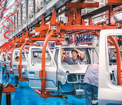 Employees work on a general assembly line at Guizhou Wanren Auto Groups in Wanshan district, Tongren, southwest China’s Guizhou province. The district uses funds for poverty alleviation as impoverished households’ share capitals in the company and allocates dividends to 750 impoverished people. (Photo/Peng Jun)