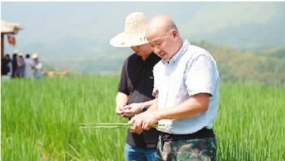 Jin Yuepin (right) checks the growth condition of rice. (Photo/Lin Dajun)