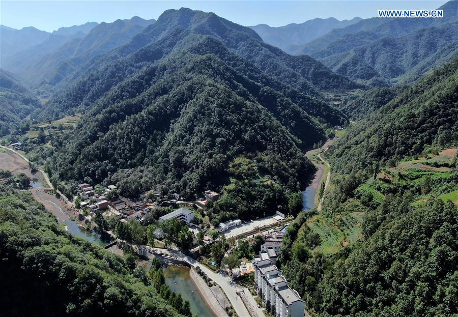Aerial photo taken on Sept. 2, 2020 shows a view of Dawanggou Village in Deting Town of Songxian County, Luoyang City, central China's Henan Province. Dawanggou Village, located in a mountainous area, used to be an impoverished village. In recent years, the local government has made efforts in improving the living conditions of the villagers, carrying out relocation and renovation work. By improving the appearance of the village, rural tourism has been developed, which helps people here get rid of poverty without working far away from home. (Xinhua/Li An)