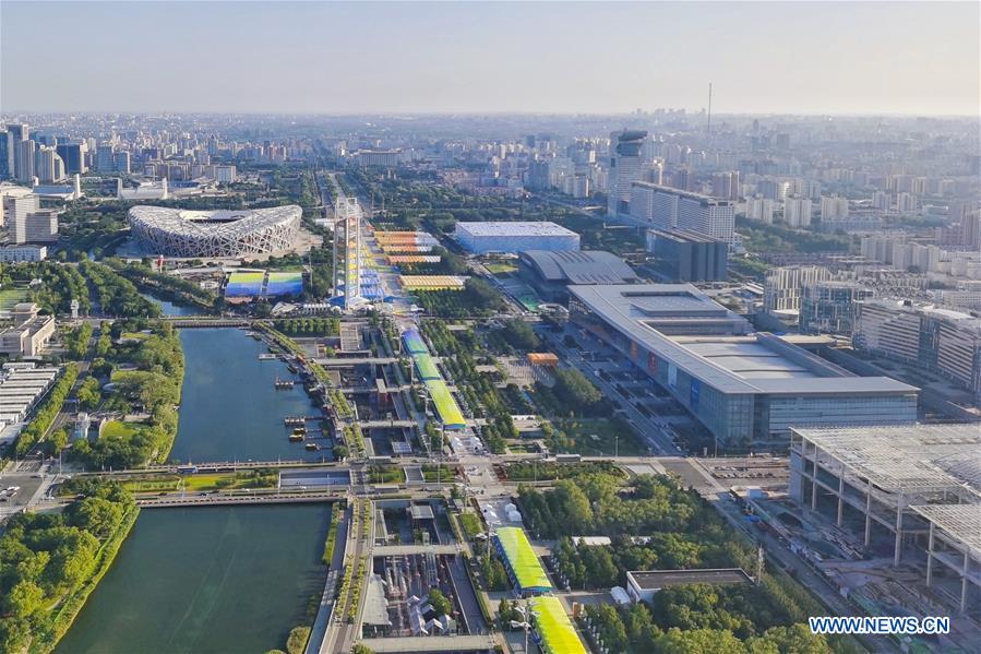 Photo taken with mobile phone on Sept. 4, 2020 shows an exhibition zone of the 2020 China International Fair for Trade in Services (CIFTIS) in Beijing, capital of China. The CIFTIS 2020 opened Friday in Beijing. It is the first major international economic and trade event held both online and offline by China since the COVID-19 outbreak. (Xinhua/Meng Jing)