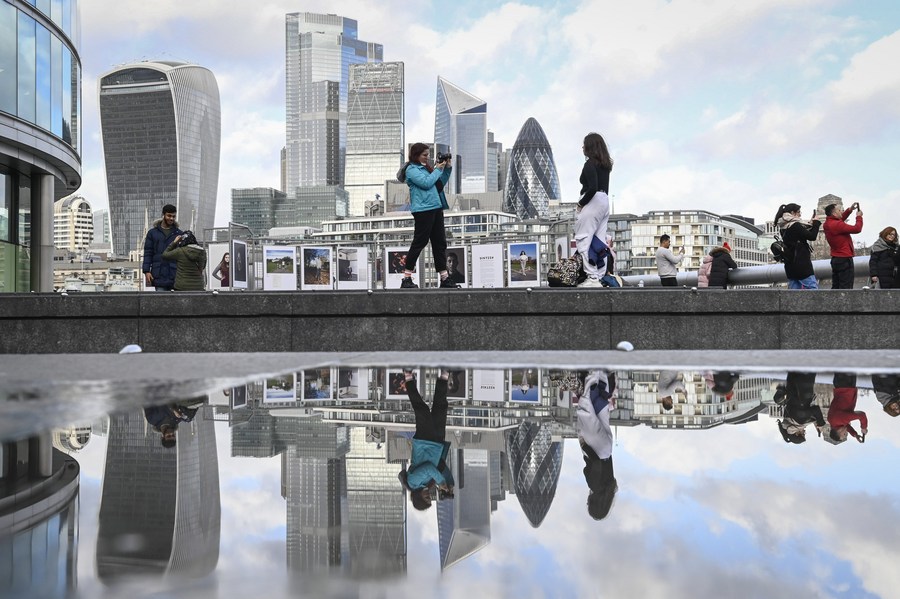 People are seen in front of buildings in the City of London, London, Britain, on Feb. 1, 2020. (Photo by Stephen Chung/Xinhua)