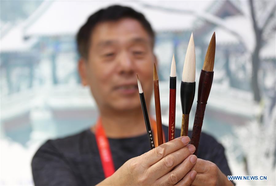 Wu Jingsheng shows traditional Chinese writing brushes at the tourism services exhibition area during the 2020 China International Fair for Trade in Services (CIFTIS) in Beijing, capital of China, Sept. 6, 2020. Inheritors of traditional handicrafts and intangible cultural heritages demonstrated their skills at the exhibition area of the ongoing CIFTIS 2020 on Sunday. (Xinhua/Yin Gang)
