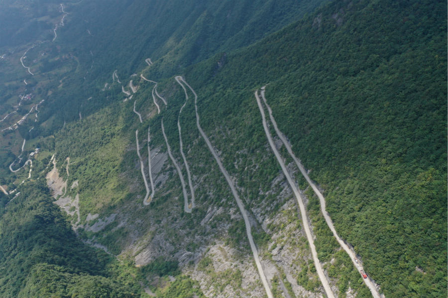 Aerial photo taken on Sept. 1, 2020 shows a view of the breathtaking "sky road" on the cliff in Enshi, in China's mountainous Hubei Province. The road looks like a jade belt in the mountains, and is known for its harrowing twists and turns. The daunting “sky road” shows the tremendous effort it took for local villagers to complete the construction, and their desire to connect with the outside world. The road attracts large numbers of driving enthusiasts from miles around.(People's Daily Online/Chen Bowen)