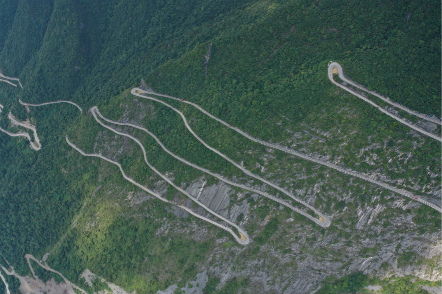Aerial photo taken on Sept. 1, 2020 shows a view of the breathtaking "sky road" on the cliff in Enshi, in China's mountainous Hubei Province. The road looks like a jade belt in the mountains, and is known for its harrowing twists and turns. The daunting “sky road” shows the tremendous effort it took for local villagers to complete the construction, and their desire to connect with the outside world. The road attracts large numbers of driving enthusiasts from miles around.(People's Daily Online/Chen Bowen)