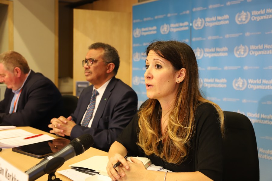 Technical lead for the WHO's Health Emergencies Program Maria van Kerkhove (R) speaks during a daily briefing in Geneva, Switzerland, on March 5, 2020. (Xinhua/Chen Junxia)