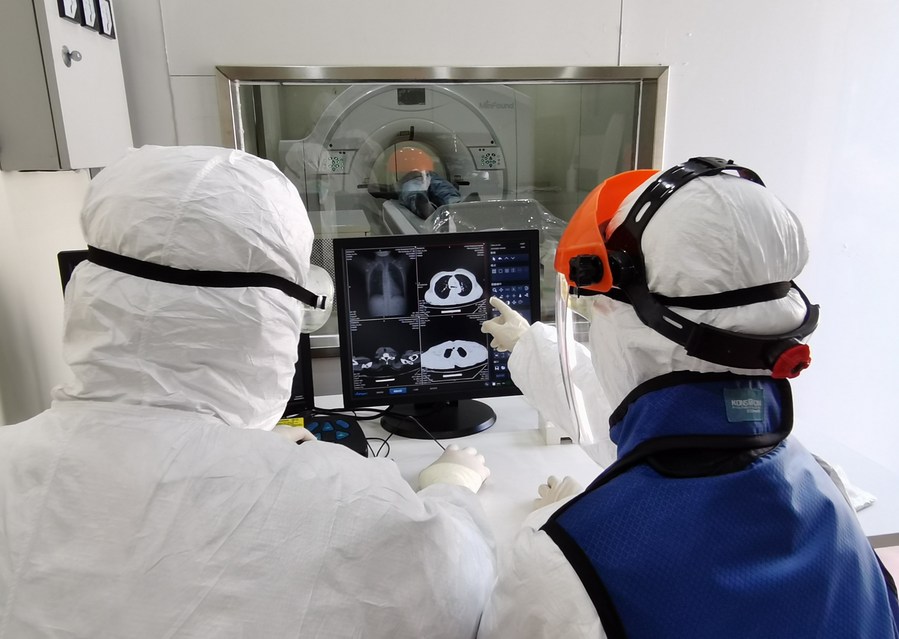 Photo taken with a mobile phone on Feb. 23, 2020 shows medical workers checking a patient's CT image with a movable CT machine at a makeshift hospital in Wuhan, central China's Hubei Province. (Photo by Gao Xiang/Xinhua)