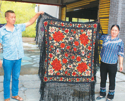 Peng Xianqun (right), a local resident, shows her embroidery work. (Photo/Lu Peifa)
