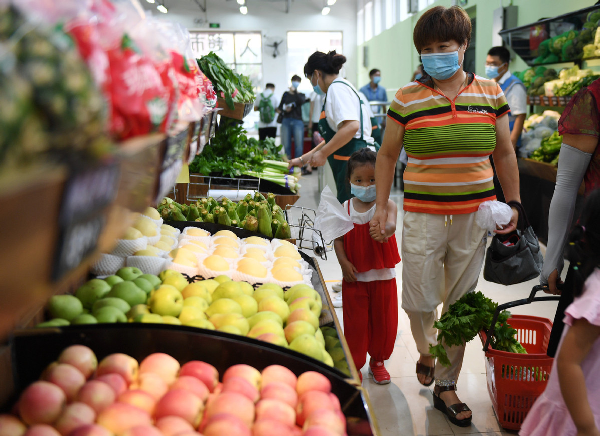 Residents buy vegetables at a newly opened supermarket near the Xinfadi market in Beijing on Aug 15, 2020. [Photo/Xinhua]