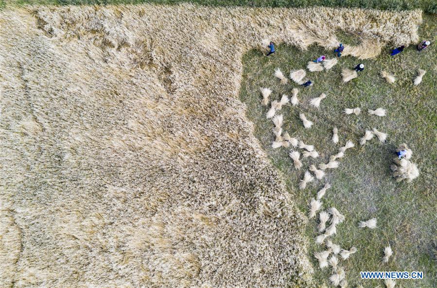 Farmers work in the farmland in Lhasa river valley in Lhasa, southwest China's Tibet Autonomous Region, Sept. 9, 2020. (Xinhua/Purbu Zhaxi)