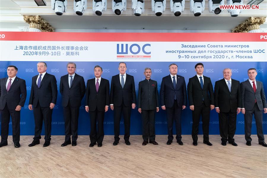 Chinese State Councilor and Foreign Minister Wang Yi (4th L) and other delegates pose for a photo ahead of a meeting of the Shanghai Cooperation Organization (SCO) Council of Foreign Ministers in Moscow, Russia, on Sept. 10, 2020. (Xinhua/Bai Xueqi)