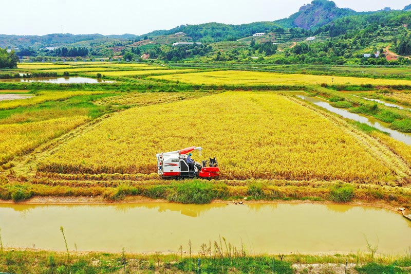 A harvester reap rice in a demonstration base of rice-crayfish farming in Huichang county, Ganzhou, East China’s Jiangxi Province, Sept. 4. Photo by Zhu Haipeng/People's Daily
