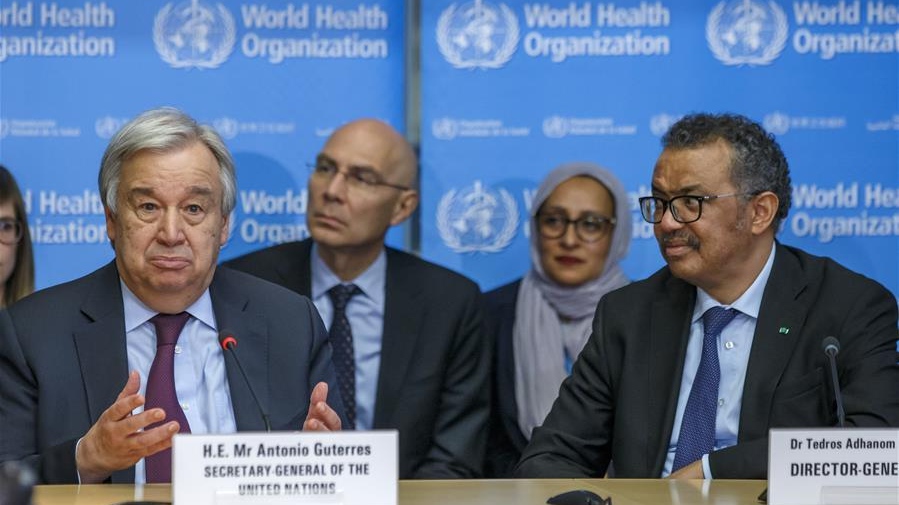 United Nations (UN) Secretary-General Antonio Guterres (L) speaks on the situation regarding COVID-19 at the World Health Organization (WHO) headquarters in Geneva, Switzerland, February 24, 2020. /Xinhua