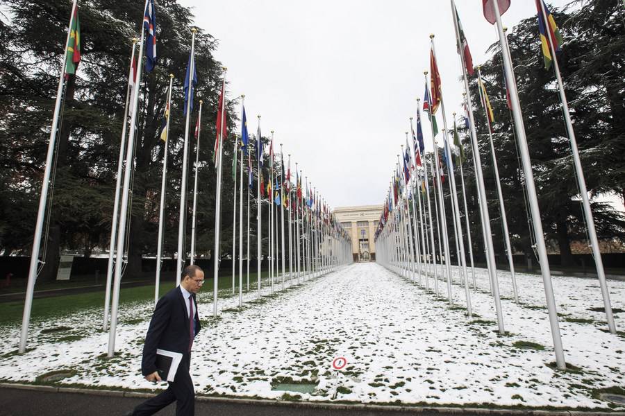 A man walks in the Palais des Nations, the headquarters of the United Nations in Geneva, Switzerland, Nov. 20, 2018. (Xinhua/Xu Jinquan)