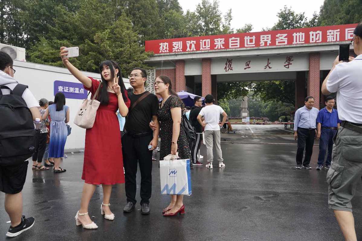 Freshmen take pictures with their parents at Fudan University in Shanghai on Sept 12, 2020. [Photo by Gao Erqiang/chinadaily.com.cn]