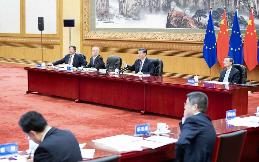 Chinese President Xi Jinping co-hosts a China-Germany-EU leaders' meeting in Beijing, capital of China, Sept. 14, 2020, via video link with German Chancellor Angela Merkel, whose country currently holds the EU's rotating presidency, European Council President Charles Michel and European Commission President Ursula von der Leyen. (Xinhua/Li Tao)