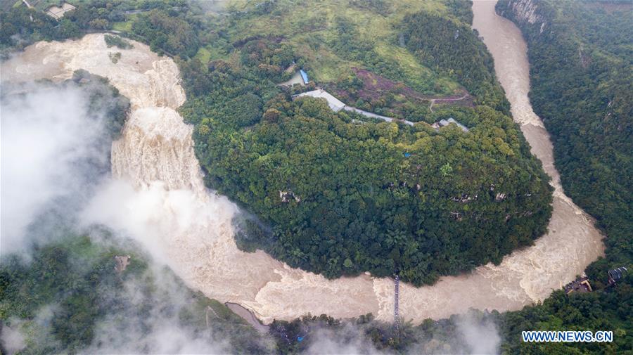 Aerial photo taken on Sept. 14, 2020 shows the Huangguoshu Waterfall in southwest China's Guizhou Province. (Photo by Chen Xi/Xinhua)