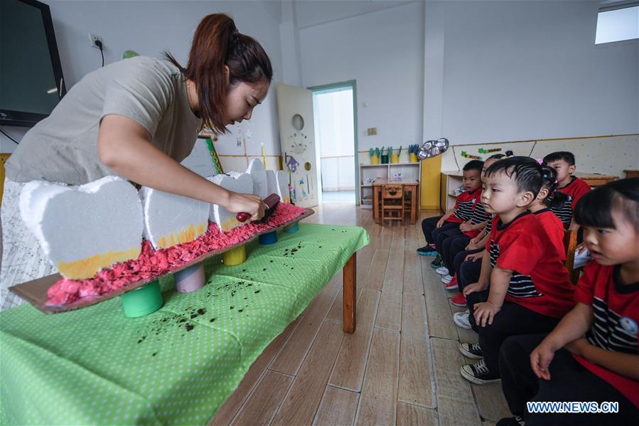 A teacher illustrates the structure of teeth and gum to children while teaching them how to brush their teeth correctly at a kindergarten in Changxing County of Huzhou, east China's Zhejiang Province, Sept. 16, 2020. China's health authority has required sound efforts in promoting the awareness of dental health among the public as part of the campaign for the country's dental care day, which falls on Sept. 20. (Xinhua/Xu Yu)