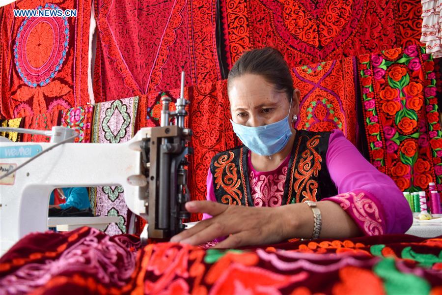 A staff member makes embroidery works at a handicraft making cooperative in Aketao County of northwest China's Xinjiang Uygur Autonomous Region, Sept. 20, 2020. Over 6,000 residents have relocated to the relocation settlements in Aketao County from less hospitable areas in the deep Kunlun Mountain. In response to the employment of relocated residents, local authorities have put great efforts into developing the traditional handicraft industry, as a way to support the poverty alleviation efforts. (Xinhua/Gao Han)