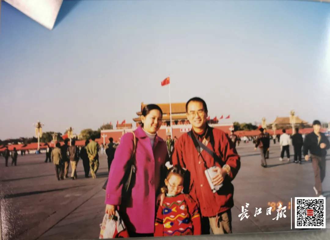 Zhang Dingyu, Cheng Lin and their daughter take a photo at the Tiananmen Square in Beijing. (Photo/Changjiang Daily)