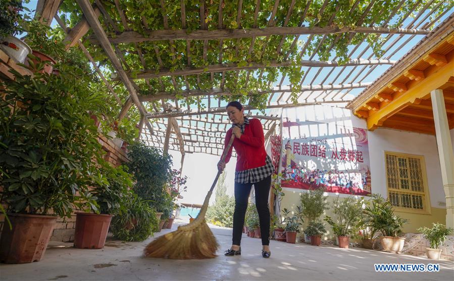 A local villager cleans the yard at home at a village in Tokkuzak Township, Shufu County, northwest China's Xinjiang Uygur Autonomous Region, Sept. 21, 2020. Taking advantages of geographical conditions, villages in Tokkuzak Township developed a series of businesses as broom making, fruit and flower planting as the local economy structure is adjusted to better help boost incomes. (Xinhua/Zhao Ge)